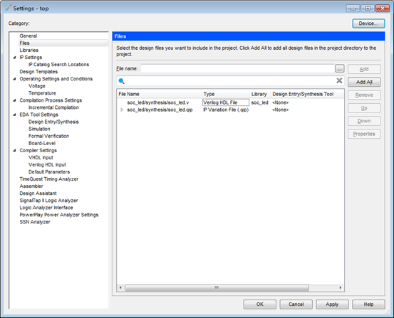 1)Quartus中点击菜单Assignments->Settings,弹出设置框,选中左侧Files一栏,添加Qsys文件soc_led.v和soc_led.qip,添加完成后如图16所示。