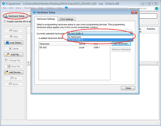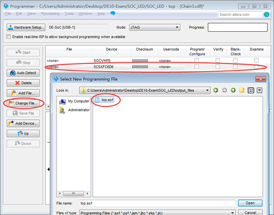 点击菜单Tools->programmer,打开编程工具,选择连接至计算机的DE10开发板,如图19所示。Close硬件设置框。编程页面中Mode选择JTAG,点击Auto Detect按钮,在弹出的器件选择框中选择相应的器件型号,DE10-Standard板载FPGA型号应选择5CSXFC6D6。选中FPGA设备,点击Change FIle,选中编译生成的top.sof文件,如图20所示。然后勾选Program/Configure,如图21所示。最后点击Start按钮开始编程。