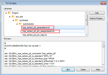 分析综合完成后,点击菜单Tools->Tcl Scripts,弹出脚本运行框,如图18所示。分别运行hps_sdram_p0_parameters.tcl和hps_sdram_p0_pin_assignments.tcl。