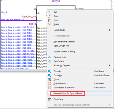 2)新建顶层文件。本实验采用的顶层文件类型为bdf(Block Diagram/Schematic File)。点击菜单File->New,选择Design Files中的Block Diagram/Schematic File后点击OK,点击菜单File->Save As将该文件保存到工程目录下,命名为top.bdf。在该原理图空白处右键Insert->Symbol,选择Qsys生成的soc_led.bsf,将该模块插入到顶层原理图文件中。选中插入的元件,右键点击Generate Pins for Symbol Ports,为元件添加输入输出端口,如图17所示。