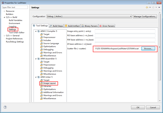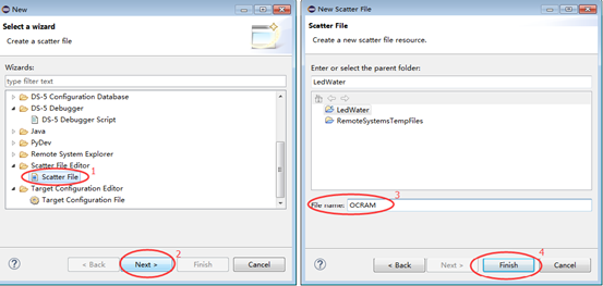 操作:点击菜单File->New->Other,弹出对话框,按图5操作。打开新建的scat文件,输入上面的分散文件内容。在DS-5左侧的Project Explorer中选中LedWater工程,右键点击Properties。弹出的对话框按图6设置,完成scat文件路径的添加。