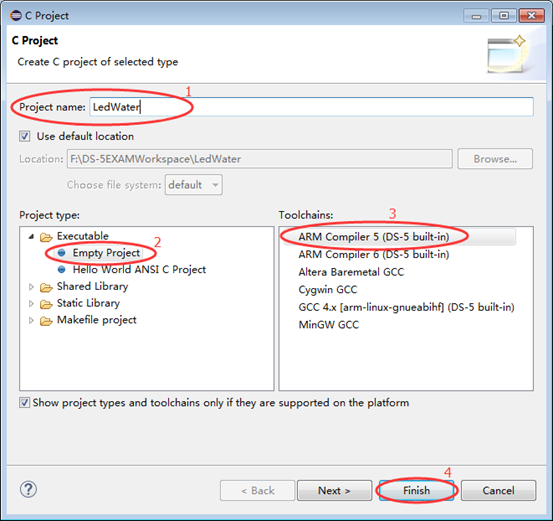点击菜单File->New->C Project,弹出工程配置框如图3所示,按图完成设置,注意编译工具链选择ARM Compiler 5