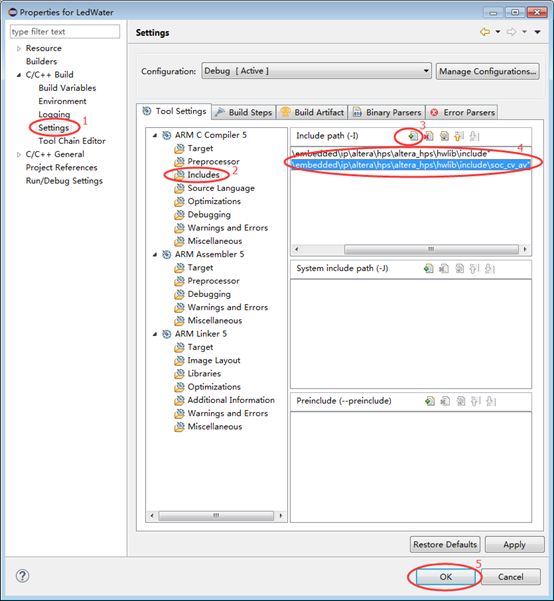 因为本实验用到了SOC EDS提供的HWLIB中的API访问硬件,所以要在项目编译选项中添加HWLIB路径。HWLIB所在路径为:<SOC EDS安装路径>ipalterahpsaltera_hpshwlibinclude 和 <SOC EDS安装路径>ipalterahpsaltera_hpshwlibincludesoc_cv_av