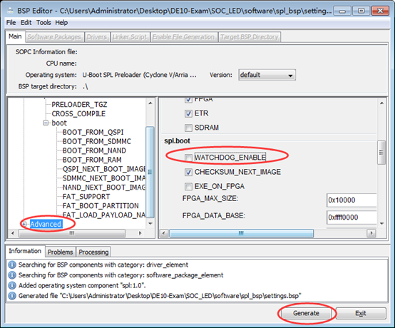 裸机工程中,preloader即u-boot-spl。在shell中输入bsp-editor启动工具,如图8所示。在打开的bsp-editor工具中,点击菜单File->New HPS BSP,选择handoff文件目录,如图9所示。设置中取消勾选WATCHDOG_ENABLE选项,如图10所示,因为我们没有在裸机应用程序中用到看门狗。设置完成后点击generate,产生我们设置的preloader源代码,生成的源代码路径显示在Information栏中。Shell中cd到preloadre源代码目录下,输入make -j8 (多线程编译提高编译效率),如图11所示,回车生成preloader二进制文件,需要等待几分钟。在<Quartuas工程目录>softwarespl_bspuboot-socfpgaspl目录下,可以看到已经生成了u-boot-spl二进制文件。将其拷贝至LedWater工程目录下。