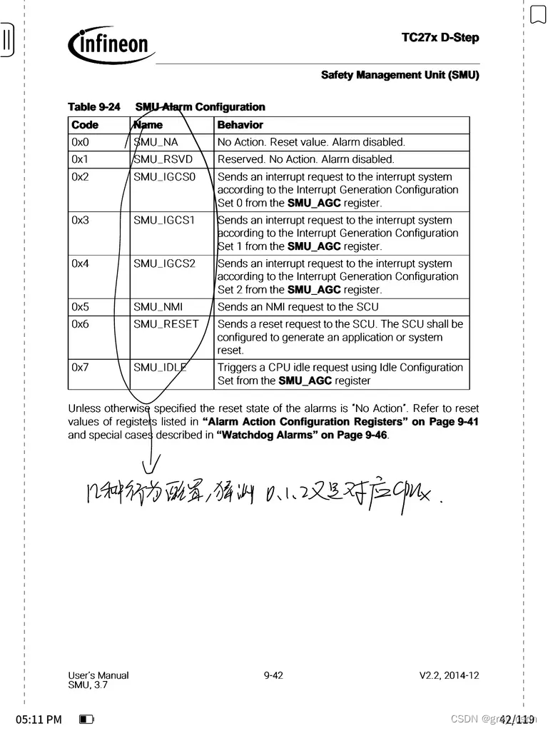 处理处理来自MCU各个部门的Alarm之外,SMU还可以报出属于自己的Alarm信号。这个表格给出来的是SMU本身支持的四个Alarm。