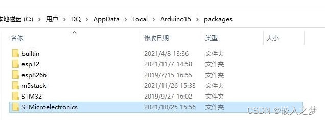 目录名从STM32改为STMicroelectronics,应该是为了日后增加更多的旗下产品,目前除了STM32外,STM8系列也支持在Arduino IDE 下编程了: