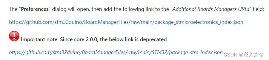 第一:ST公司已经将STM32Duino升级到2.1 版本,从2.0版本开始启用新的Arduino开发板管理链接,老的已经不再使用了,详见: