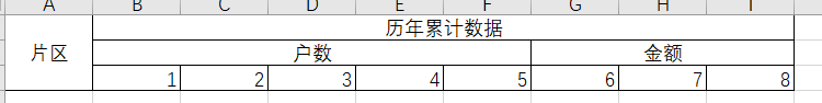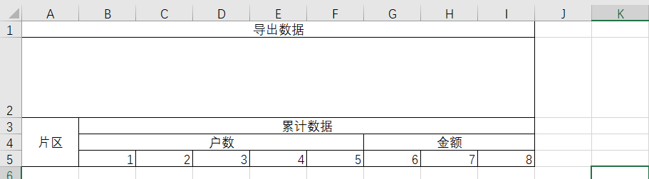 本文所用的excel样式,如果列更多、更复杂,直接套用就行 (下方图片中的数字是列名),行序号为1的是表格标题名称,行序号为2的是适应导出时把条件也导出来的情况,别怀疑,就是有这种需求!!