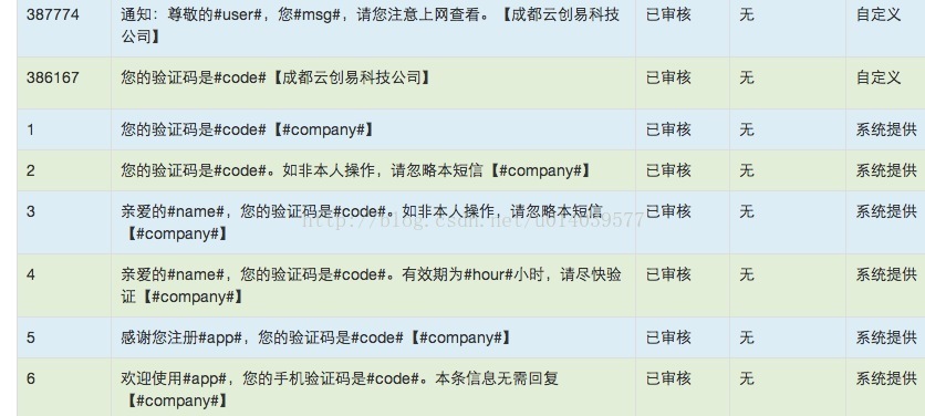 一、首先需要在云片网注册一个号码,网站链接:猛戳这里,当然这个网站是要收费的,在这个网站上可以定义模板,也就是你需要发的短信的样式,如下图:
