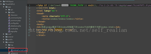 我们看一下文件编译的结果,我们知道我们现在写的是一个html文件,但是我们当前的系统是php,我们的模板最终也会编译成php文件执行,输出我们想要的结果,它编译的文件在runtime/temp目录下,找到对应的编译文件