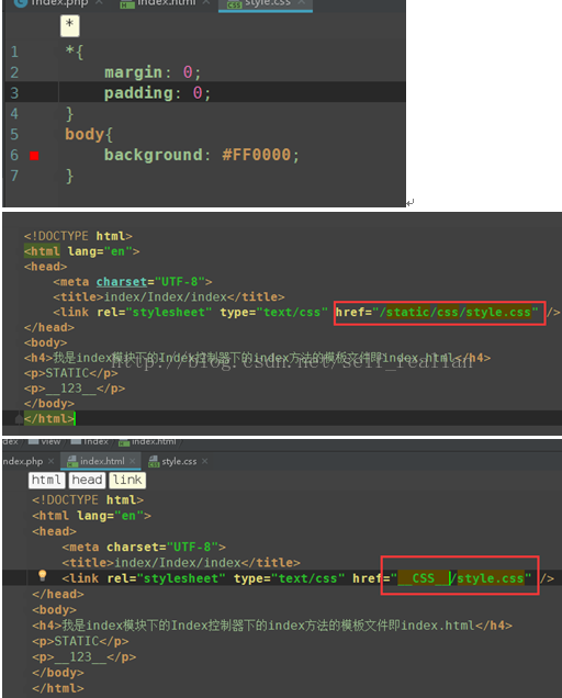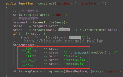 这样我们在模板中使用__CSS__对应的就是/front/css目录。通过简单的配置就能改变项目中所有样式相关的路径,这对我们后期的维护是相当方便的。这些默认的替换在thinkphp/library/think/View.php