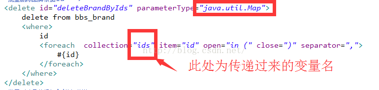 - <delete id="deleteBrandByIds" parameterType="java.util.Map">