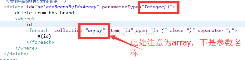 - <delete id="deleteBrandByIdsArray" parameterType="Integer[]">