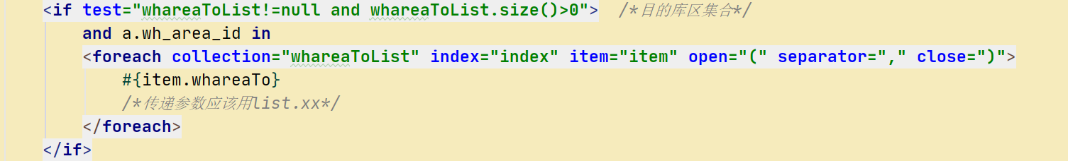 <if test="whareaToList!=null and whareaToList.size()>0"> /*目的库区集合*/