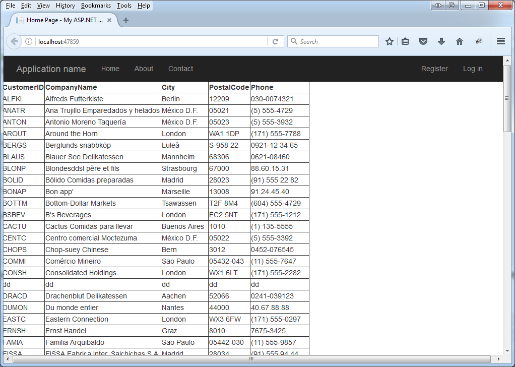 <%@ Page Title="Home Page" Language="C#" MasterPageFile="~/Site.Master" AutoEventWireup="true" CodeBehind="Default.aspx.cs" Inherits="Demo.Northwind.Webforms._Default" %> <asp:Content ID="BodyContent" ContentPlaceHolderID="MainContent" runat="server"> <div class="row"> <asp:GridView ID="customersGridView" runat="server"></asp:GridView> </div> </asp:Content>