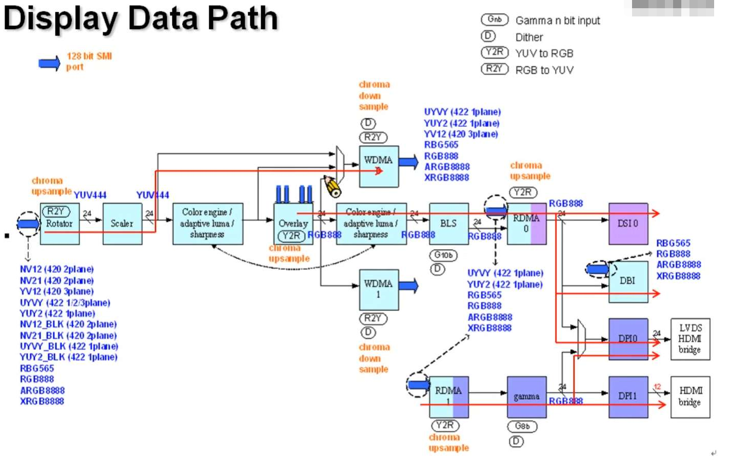 数据输入:direct link scaler format,YUV or RGB;memory source format.可以直接从上级模块SCL or PQ,也可以直接从memory输入