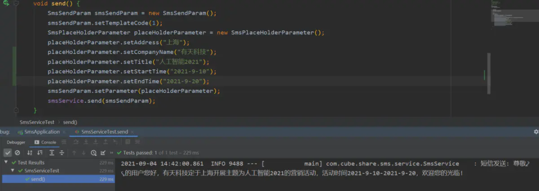 2021-09-04 14:34:36.261 INFO 5528 --- [ main] com.cube.share.sms.service.SmsService : 短信发送: 尊敬的用户您好,{companyName}定于上海开展主题为{title}的营销活动,活动时间{startTime}-{endTime},欢迎您的光临!