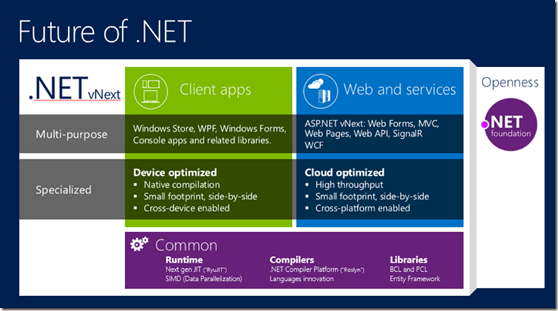 .NET未来构想图,对于 ASP.NET vNext 来说,可以看出尤其侧重于云优化-Cloud Optimized,包含高吞吐量、低内存消耗、并行执行和跨平台: