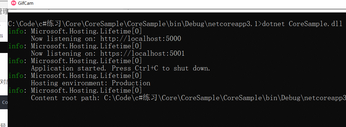 dotnet CoreSample.dll //直接运行net core 程序,默认以 launchSettings.json 文件中配置url启动