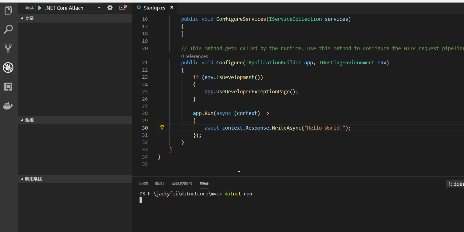 如果您使用的是vs code进行跨平台开发,那么dotnet watch run对你的调试就是一把利器!我们先看下使用dotnet run的效果: