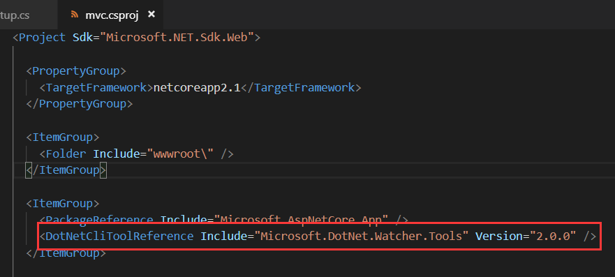 <DotNetCliToolReference Include="Microsoft.DotNet.Watcher.Tools" Version="2.0.0" />