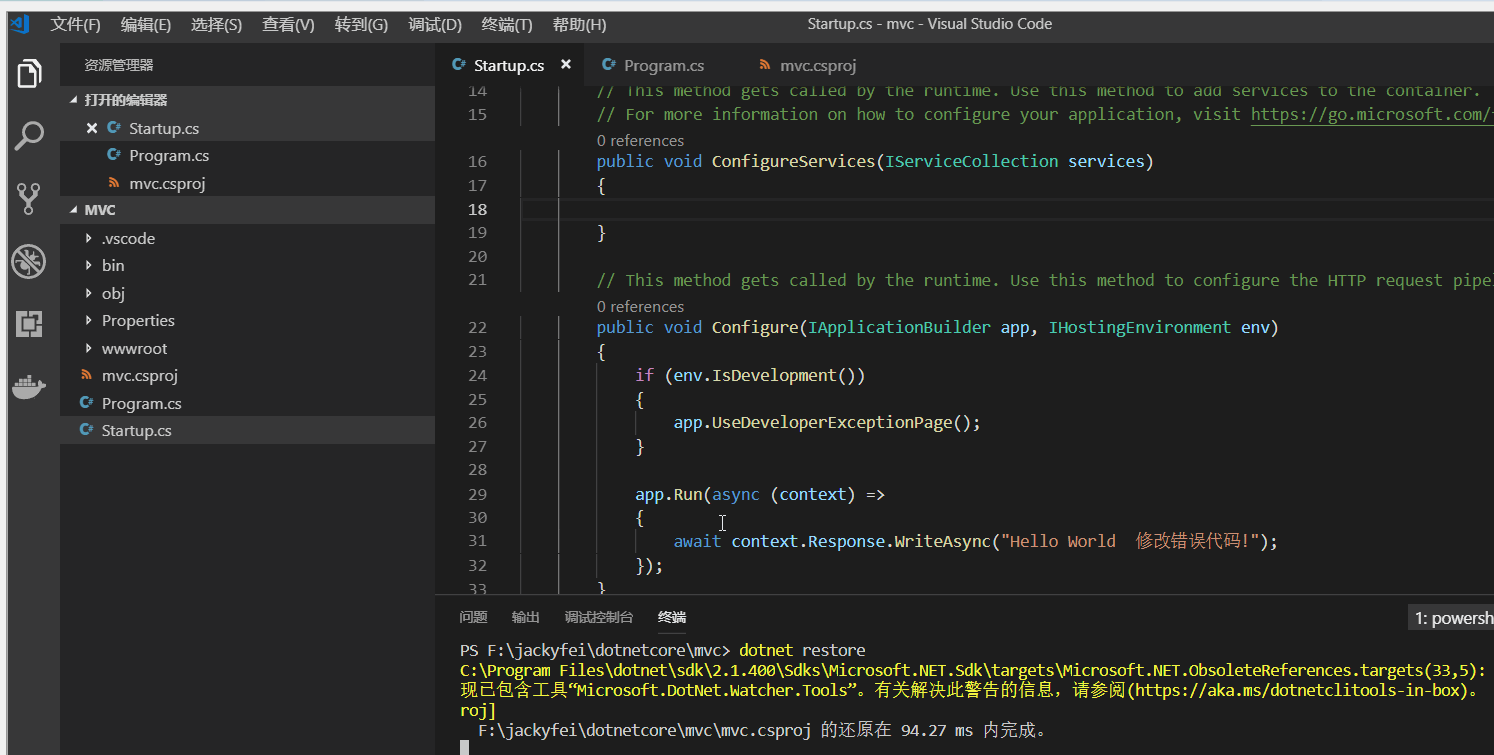 接下来,我们重新dotnet restore一下,然后运行dotnet watch run,大功告成!这个时候不管我们对源码如何修改,我们只要到浏览器端重新F5一下,一切搞定,只不过,你会发现,刷新的时候,有点延迟,那是因为内部另起一个对文件监控的线程,所以当你修改代码后,监控线程的反应速度没有你快捷键来得快而导致的,不过这不是问题,通常情况你的速度跑不过机器。