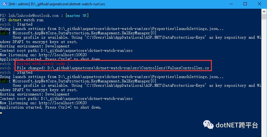 当我修改了ValuesController.cs文件的内容的时候,watch会自动退出当前正在运行的进程,然后再一次启动它。是不是很方便呢?