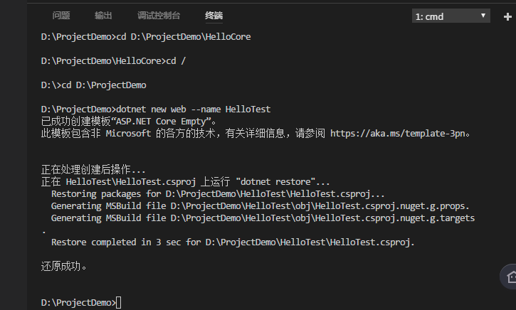 dotnet watch run我们要用到Visual Studio Code开发工具,打开Visual Studio Code,使用组合键Ctrl+Shift+Y打开调试控制台,选择终端,跳转到ProjectDemo文件夹下面