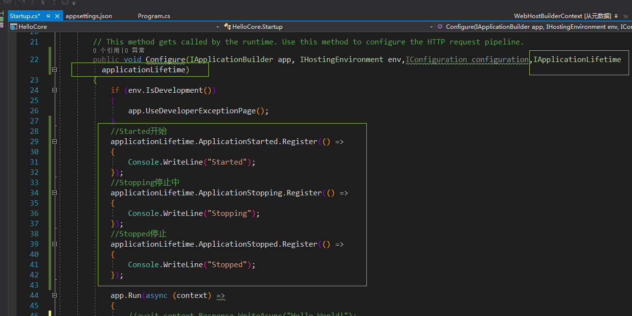 ApplicationLifetime可以在应用开始、结束中、结束后的时候执行委托的事件