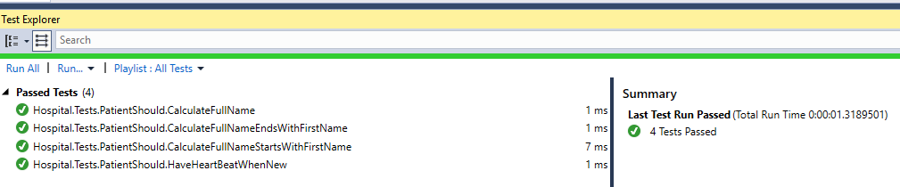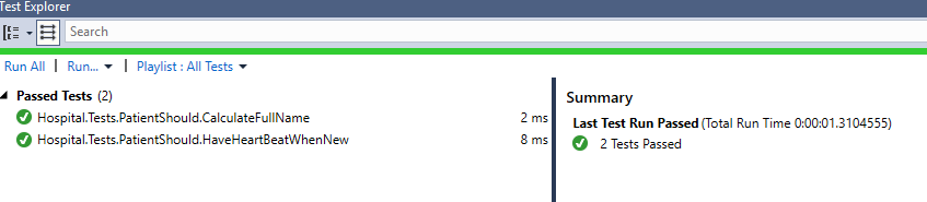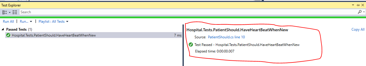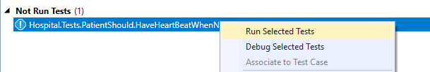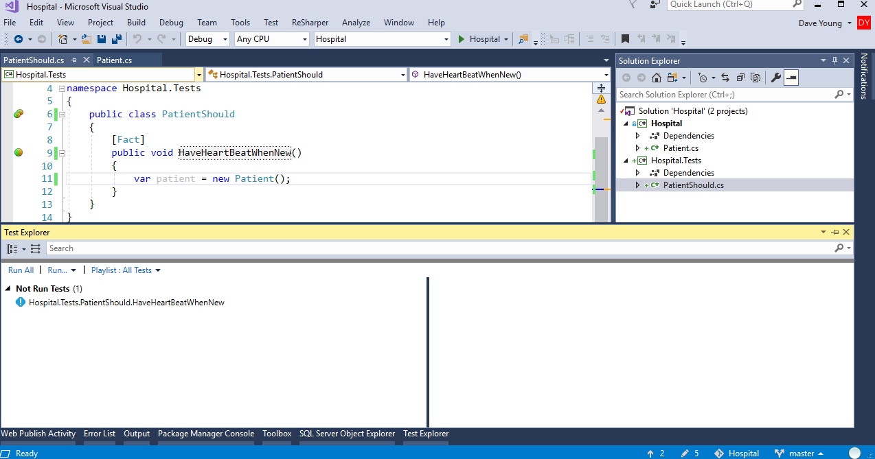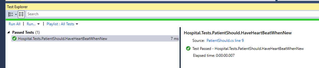 public class PatientShould { [Fact] public void HaveHeartBeatWhenNew() { var patient = new Patient(); Assert.True(patient.IsNew); } }
