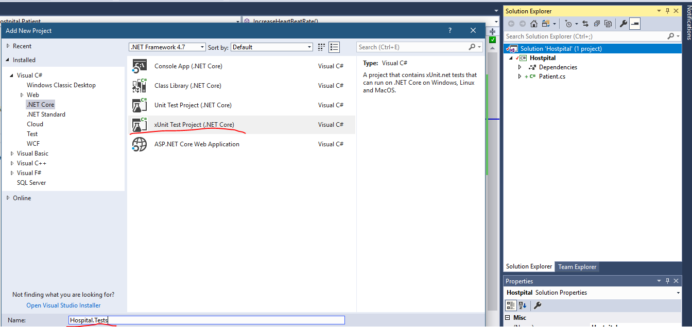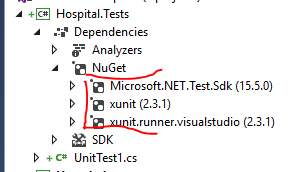 首先建立一个C# library项目,叫Hospital(下面部分截图有个拼写错误,应该是Hospital),然后建立一个xUnit Test项目,叫Hospital.Tests: