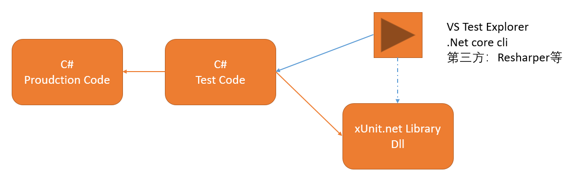 测试项目需引用被项目从而对其进行测试,测试项目同时需要引用xUnit库。测试编写好后,用Test Runner来运行测试。Test Runner可以读取测试代码,并且会知道我们所使用的测试框架,然后执行,并显示结果。目前可用的Test Runner包括vs自带的Test Explorer,或者dotnet core命令行,以及第三方工具,例如resharper等等。