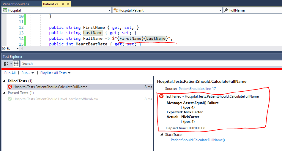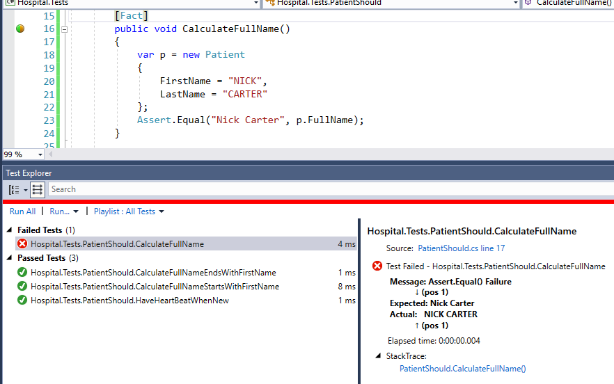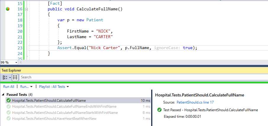 [Fact] public void CalculateFullName() { var p = new Patient { FirstName = "Nick", LastName = "Carter" }; Assert.Equal("Nick Carter", p.FullName); }