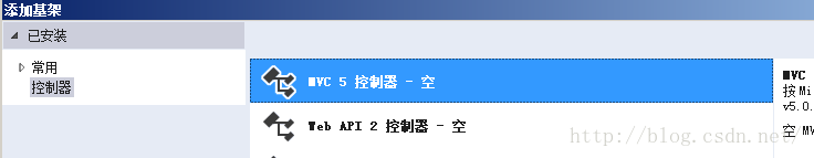 在“添加基架”Add Scaffold对话框中,点击MVC5 控制器-空(MVC5 Controller-Empty),点击添加。