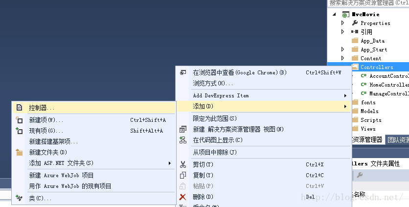 让我们开始创建一个Controller类。在解决方案资源管理器中,右击Controllers文件夹接着点击“添加”Add>”控制器”Controller。