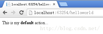 }控制器将会返回一个HTML字符串为例。这个Controller名为HelloWorldController并且第一个方法名为Index。让我们在浏览器中调用他。运行这个应用程序(按F5或Ctrl+F5)。在浏览器中附加“HelloWorld”到地址栏路径中。(例如,下面的图解,
