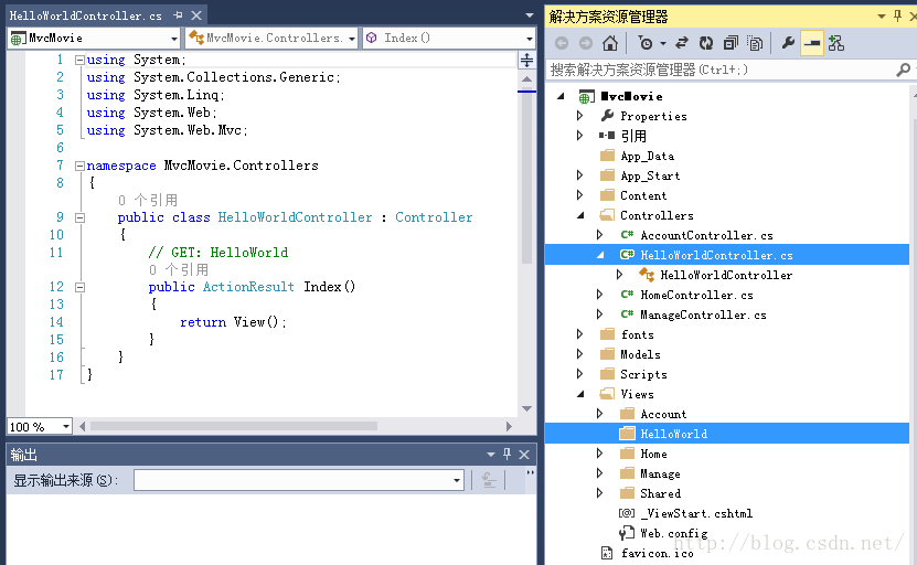 注意到在解决方案资源管理器中,文件HelloWorldController.cs和新的文件夹ViewsHelloWorld已经被创建了。该控制器在IDE中打开了。