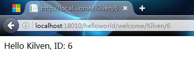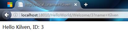 public string Welcome(string name, int ID = 1) { return HttpUtility.HtmlEncode("Hello " + name + ", ID: " + ID); }运行应用程序并且输入下面的URL: http://localhost:xxx/HelloWorld/Welcome/3?name=Kilven