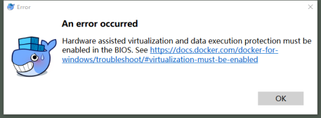 安装完后,会提示点击重启电脑。重启后会自动启动Docker程序,如果弹出下图所示提示,则需要在Windows 功能中启用Hyper-V功能和 在BIOS CPU配置中打开 “虚拟化配置”,打开之后,如下图所示,虚拟化会显示已启用。反之安装成功。