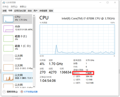 注意虚拟化已启用,如下图所示(这里秀一把我NB的台式机,是不是比你们的服务器都高端N个档次):
