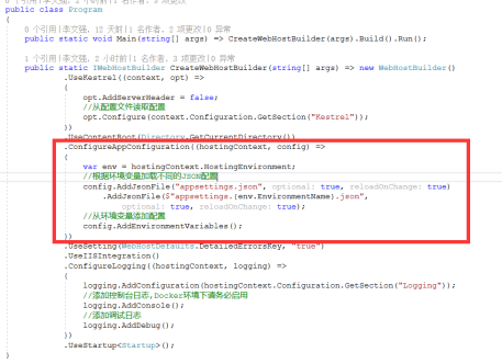 因此在代码中,我们可以根据环境变量来启用或关闭相应的功能,其中场景最广泛的一点是——根据不同的环境加载不同的配置。同时,内置的环境变量配置提供程序(EnvironmentVariablesConfigurationProvider)还可以在运行时从环境变量键值对加载配置。具体见以下代码: