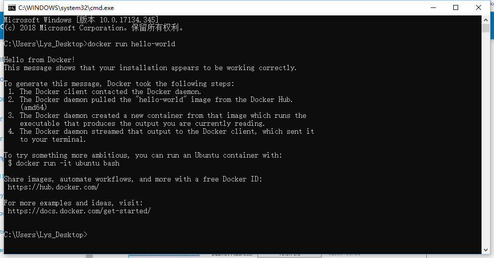 这是我们可以测试Docker环境是否正常,打开命令行,输入docker –version: