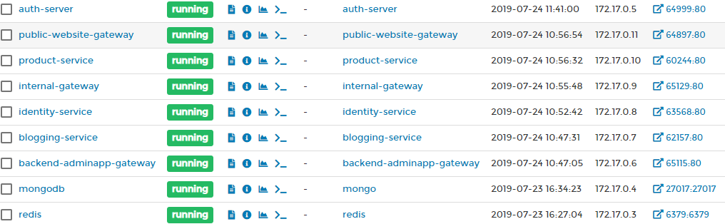 这三个微服务可以单独部署,也可以通过docker集群部署,服务中发布的接口可以直接调用,但是建议不要单独调用服务中的接口,最好通过网关调用。docker部署效果: