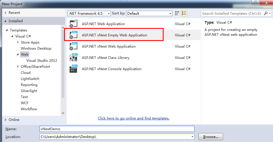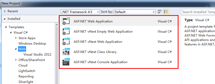 - ASP.NET vNext Web Application:用于创建 Web 应用程序。
