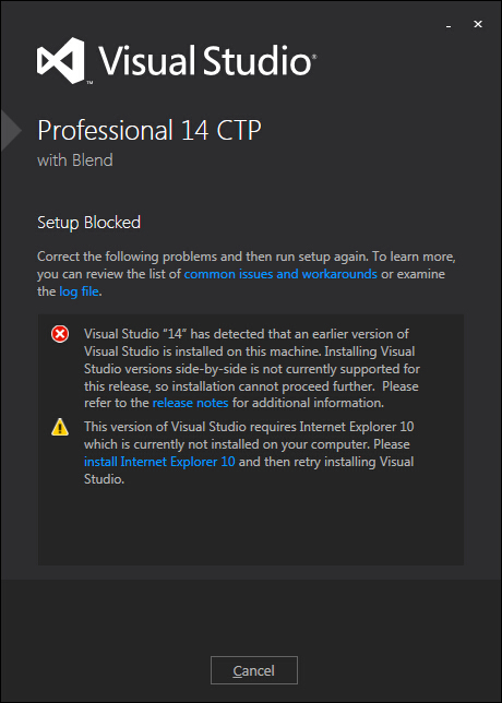 从版本中可以看出,VS 14 CTP 仅用于测试和反馈,只提供英文版本,而且安装 VS 14 CTP 会和已有的 Visual Studio 版本冲突,也就是说安装 VS 14 CTP 要把电脑中 Visual Studio 其他版本卸载,才能进行安装。