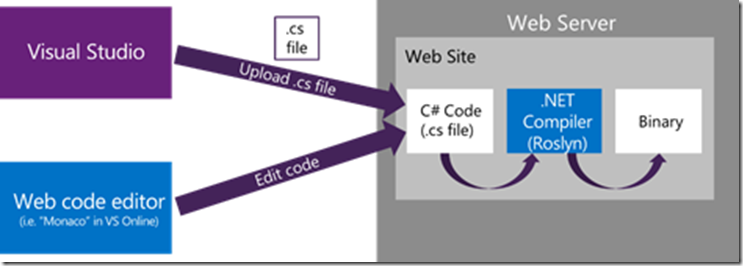 ASP.NET vNext 使用 Roslyn 编译器动态编译代码。你可以编辑一个代码文件,刷新浏览器,并看到所做的更改,并没有重建项目。除了简化开发过程,动态代码编译在现在变得可能,如在 Visual Studio Online ("Monaco") 进行代码编写,你可以选择你自己的编辑器和工具。