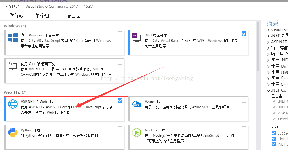 然后如下图安装选项,给asp.net和web开发打勾
