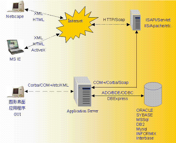 后台数据库可以是独立的数据库,也可以是多个数据库的集群。理论上它可以是诸如 Oracle 、 Sybase 、 MSSql 、 DB2 、 Informix 、 Mysql 、 Interbase 等 任何关系型数据库,该数据库不再承担复杂的数据处理任务,只是用来存储和管理数据,而复杂的业务处理逻辑则交由中间层应用服务器处理。严格说来,它是系统 的数据容器。通过“减压”之后的数据库服务器将在应对大容量并发数据访问的操作中显示卓越性能,这也是多层分布式应用的一个优势之一。