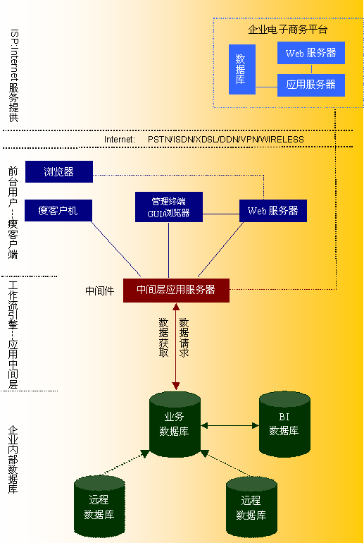 我 的工作流引擎位于中间层应用服务器上,该引擎以智能中间件的形态存在。企业所有的核心业务处理均在该中间件上实现,它也是唯一的直接与后台数据库发生信息 交换的实体。该中间层接受所有的来自客户端的业务处理请求,并根据请求类型自动派发到不同的业务处理实体,由业务处理实体负责从数据库获取数据并且执行事 实上的业务处理操作。业务处理完成后,其结果通过中间层返回给客户端。
