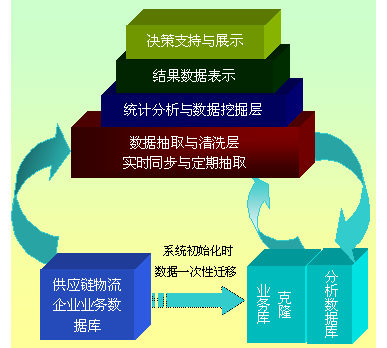 根据供应链物流管理的实际需求,考虑到巨大的数据量,数据分析不宜直接架构在实际业务数据库之上。为了减轻业务数据库的负担和保障核心业务数据的安全性,我考虑构建另外一个物理上独立的分析库,该分析库从逻辑上包括两个部分:克隆的业务库和分析数据库。